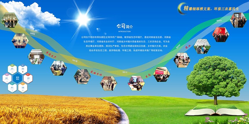 生態及農業方面,在河南省108個縣皆有生態環境規劃、創建及三農等相關業績。生態環境規劃及創建完成近500個項目,美麗鄉村建設試點完成近200個項目,高標準農田建設及村集體經濟試點完成近100個項目,在全省生態環境建設及三農工作推進中起到了模范帶頭作用。